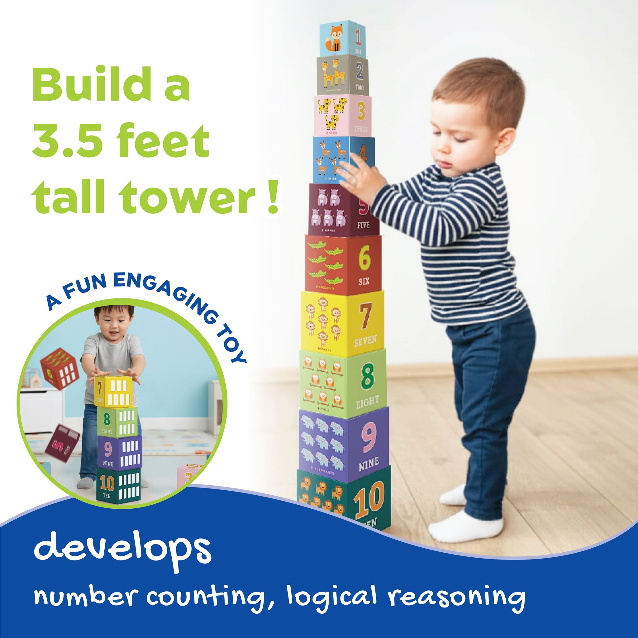 Problem-Solving & Logic: Designed to teach "cause and effect"—kids learn how size of the cube and balance affect their tower as they stack higher numbers.